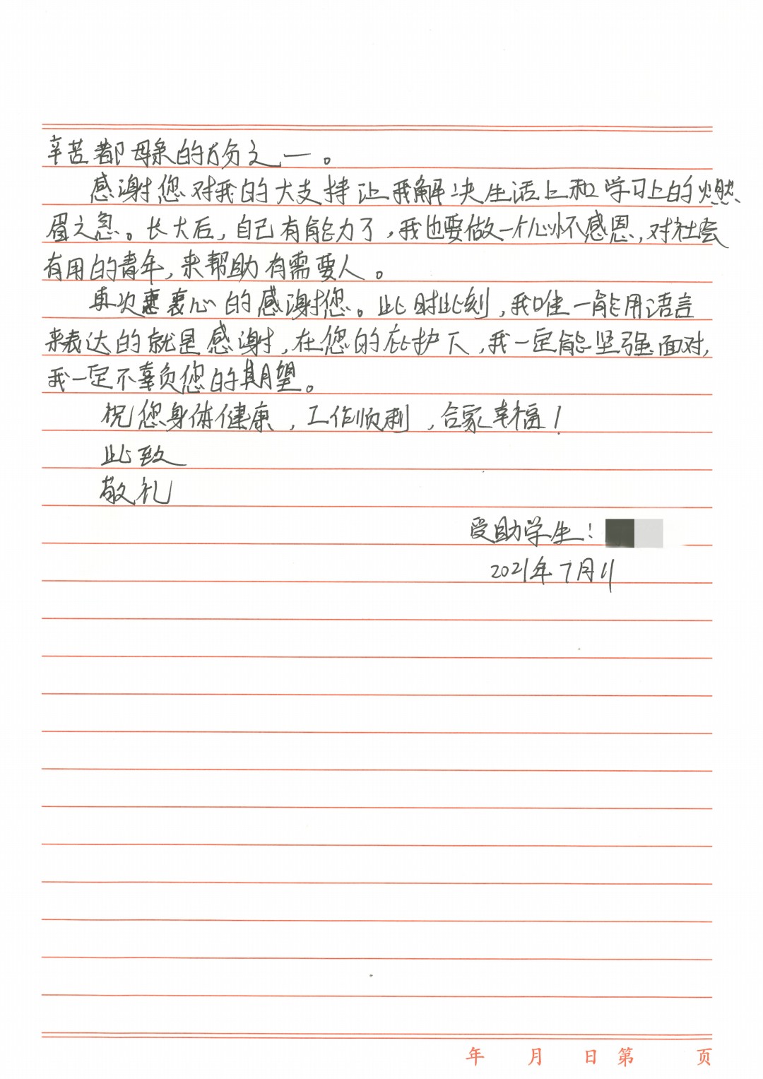 长大后,自己有能力,我也要做一个心怀感恩、对社会有用的青年,来帮助有需要的人。在您的庇护下,我一定能坚强面对,我一定不辜负您的期望。