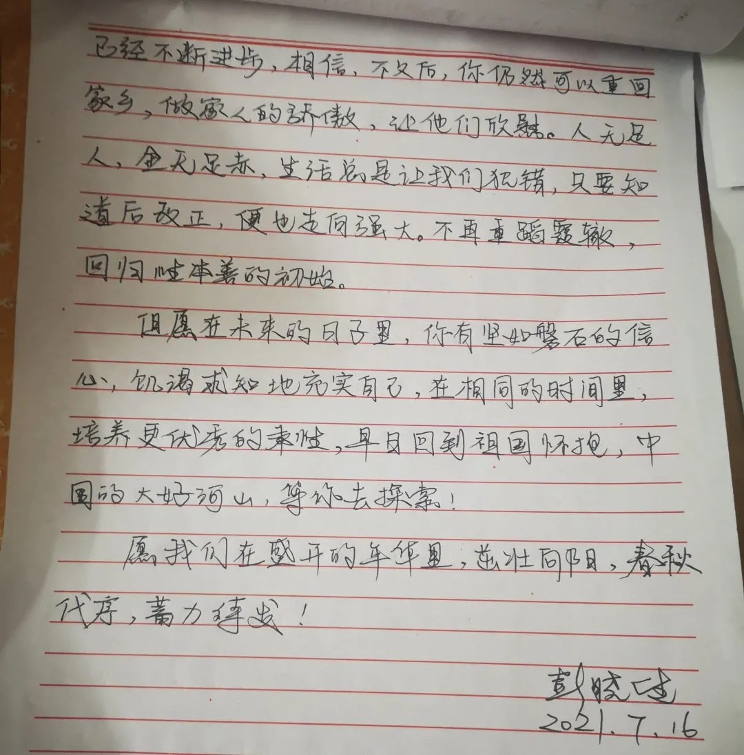 “但愿在未来的日子里,你有坚如磐石的信心,充实自己,培养更优秀的秉性,早日回到祖国的怀抱。中国的大好山河,等你去探索!”