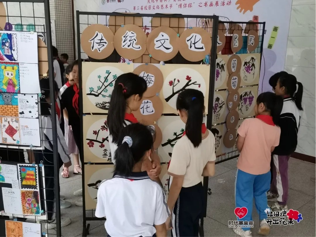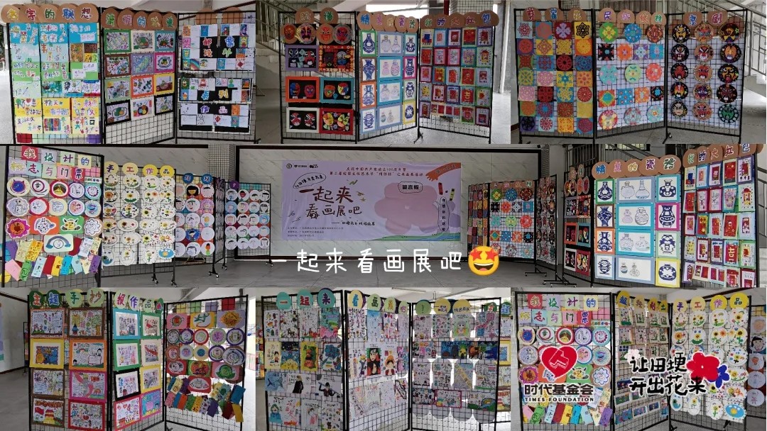 在以“一起来看画展吧”——田埂花开校园画展为主题的巨大海报下,一排排由学生们完成的作品整整齐齐地排列在展架上。