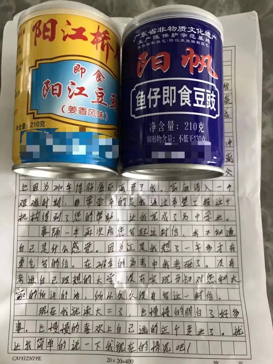 “家里有份快递,一直不知道是谁的。今天打开一看,看到里面有两份豆豉,还有一封信。我很感动!”宋美衡喜悦地向广东青基会工作人员分享。