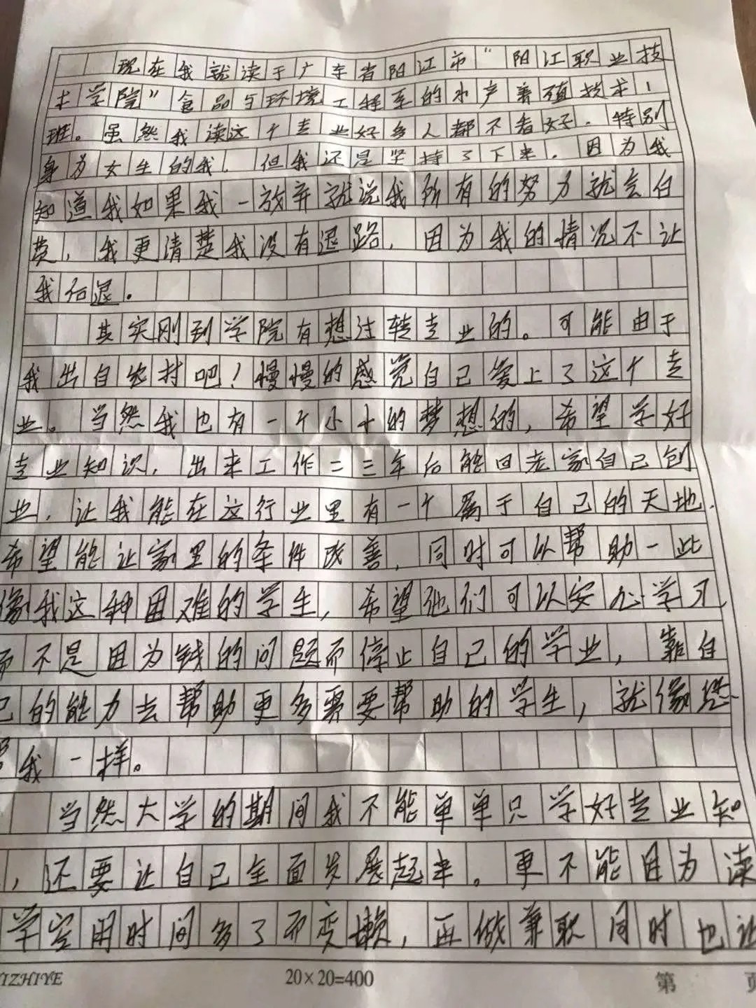 “她说,她学的水产养殖技术专业被很多人不看好。但她会坚持,因为她热爱这个专业,想用自己的所学反哺家乡,改善家里的环境,同时帮助像她一样的困难学生。”