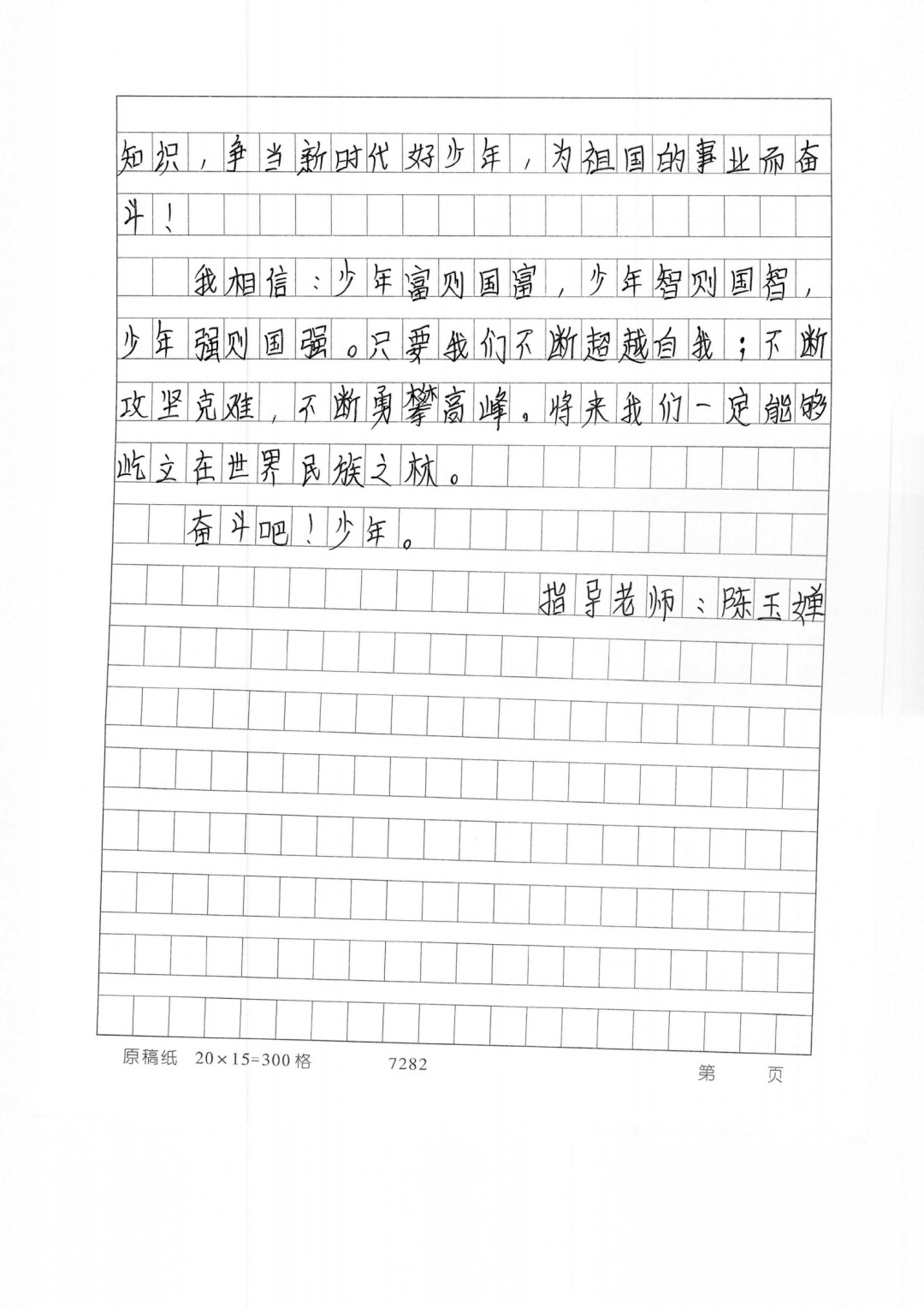 我相信:少年富则国富,少年智则国智,少年强则国强。只要我们不断超越自我,不断攻坚克难,不断勇攀高峰,将来我们一定能够屹立在世界民族之林。