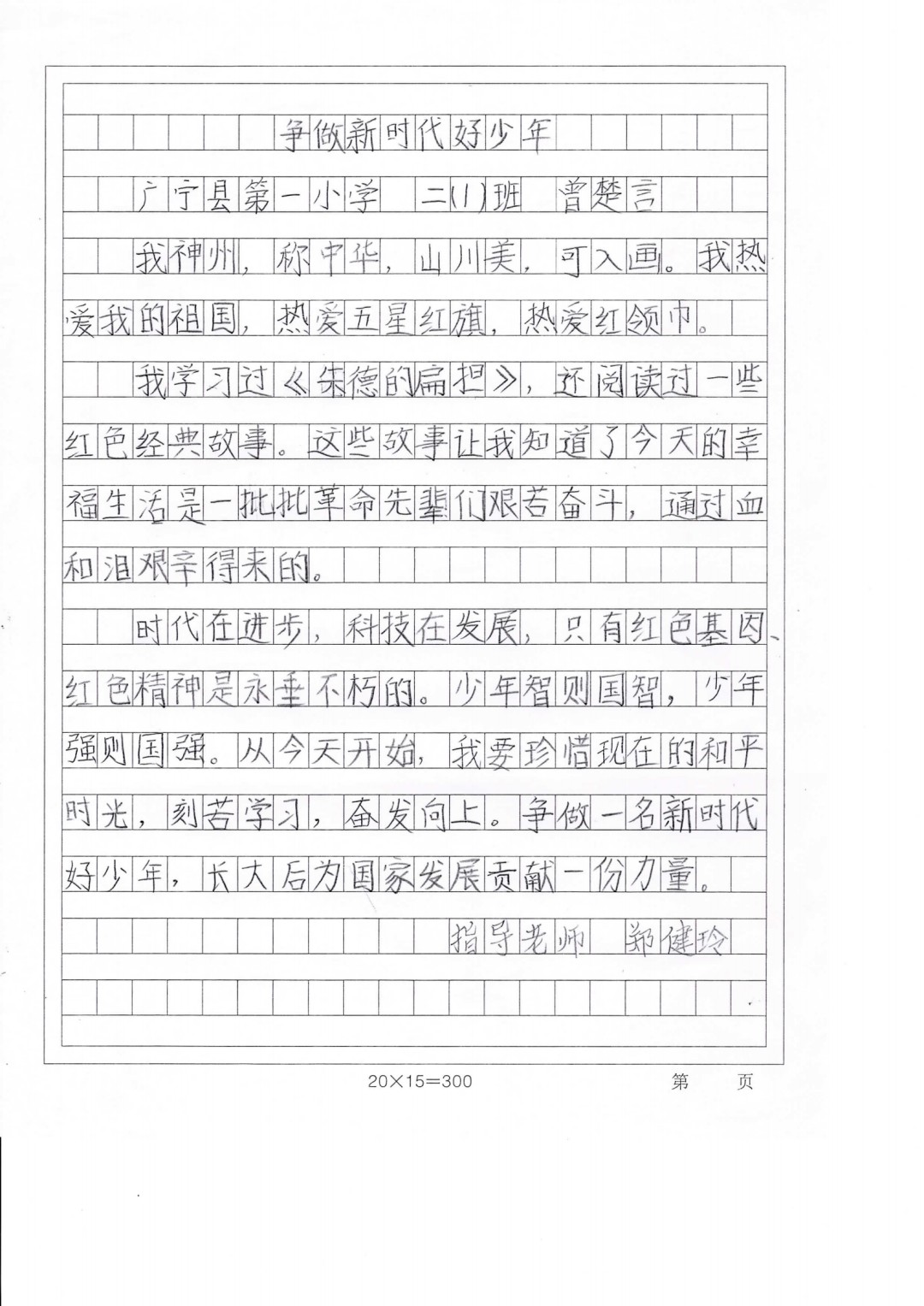 时代在进步,科技在发展。只有红色基因、红色精神是永垂不朽的。少年智则国智,少年强则国强。从今天开始,我要珍惜现在的和平时光,刻苦学习,奋发向上,争做一名新时代好少年,长大后为国家发展贡献一份力量。