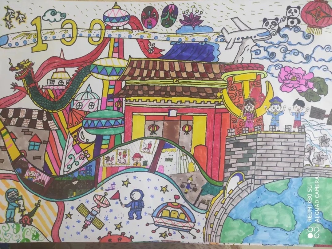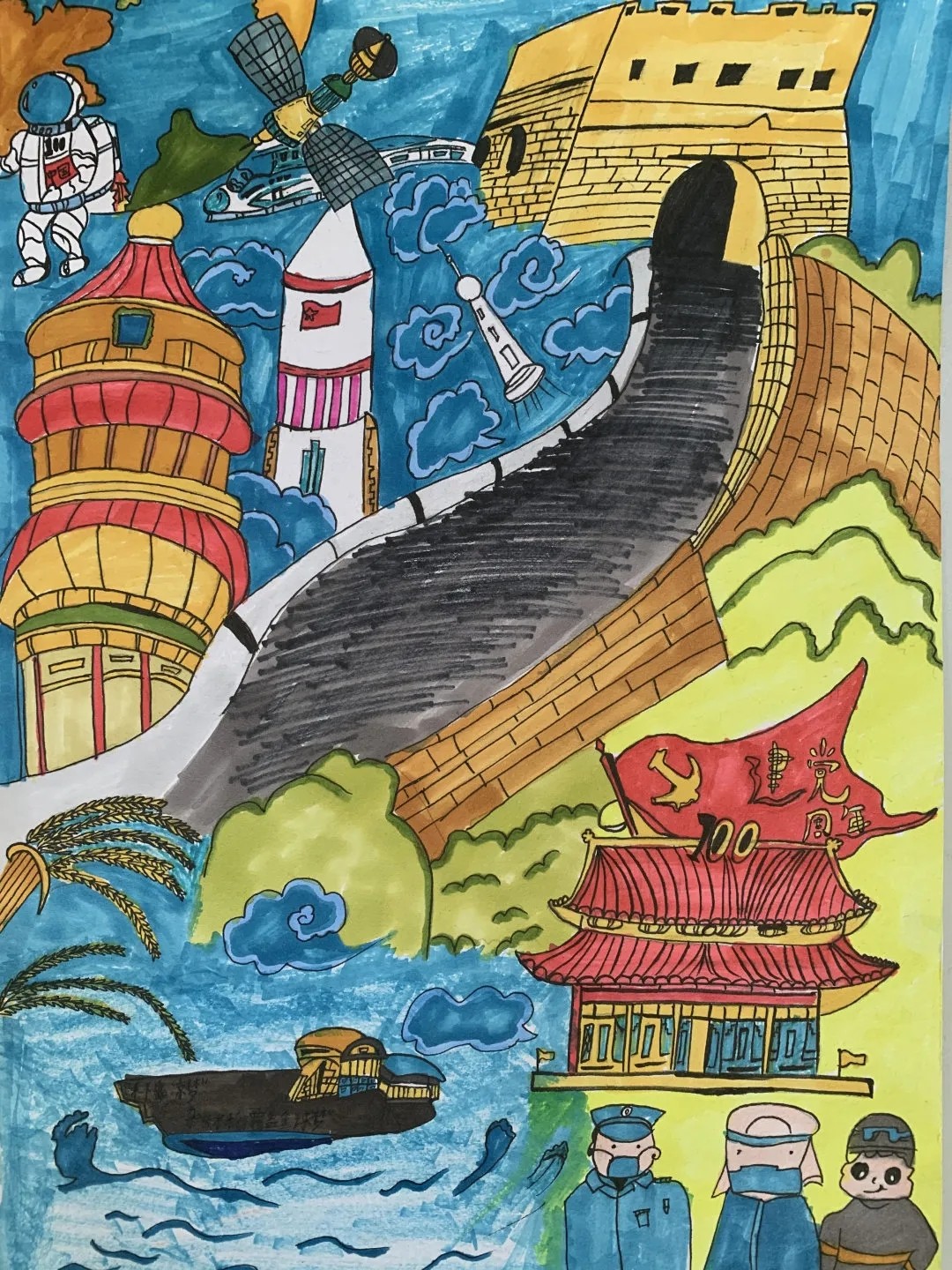 这幅画主题为童心向党。龙,是人人皆知的吉祥物,代表着吉祥、正义、兴旺和力量;舞狮则是中国民间的传统演艺,有吉祥如意之意;而天安门是我们中华民族的象征,万里长城是用战士们的鲜血而建成的,象征着中华民族伟大意志和力量;奋斗在一线的医护人员保护我们每一个的身体健康。