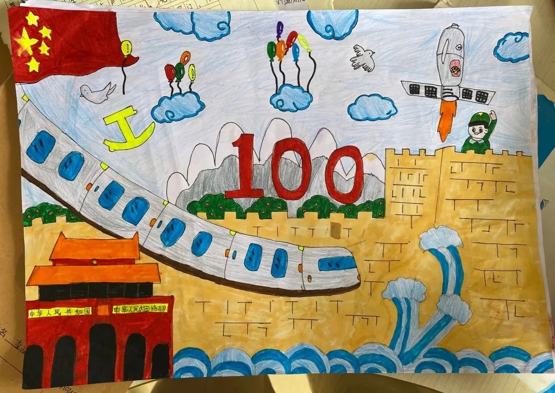一座又高又牢固又长的万里长城耸立在美丽的天安门边上,小学生们向雄伟的长城敬礼,就连可爱的国宝大熊猫也在敬礼。美丽的红旗在空中漂浮,军人坐着飞机放下彩带,彩带上写着“建党100周年”,向着万里长城敬礼。