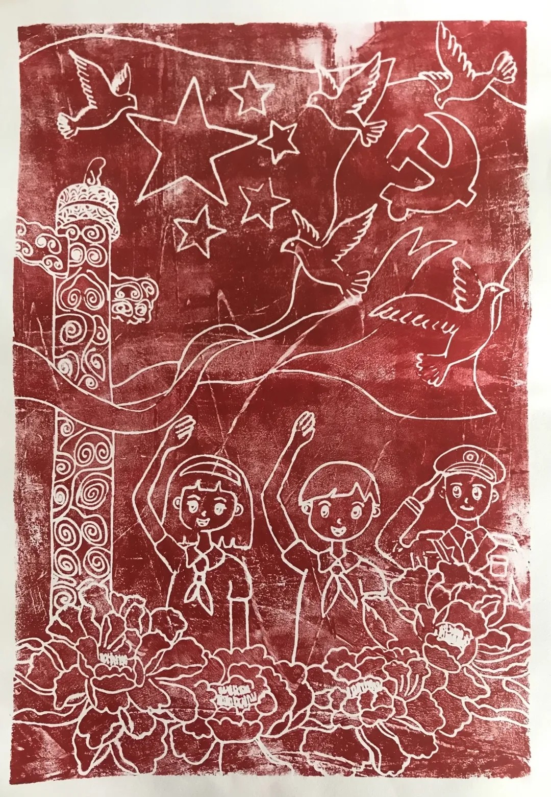 在此次活动中,我就围绕爱国爱党展开美的探索,作品38.9cm*54.6cm竖幅,采用儿童版画的形式创作,在作品中描绘有我国美好的标志性物体五星红旗、共产主义标志,和平鸽、牡丹等,与简笔的人物画结合,添上美丽鲜艳的代表色——红色,来表达我们对百年华诞的欢兴喜悦之情。这也是我为建党百年献上一份特殊美好的礼物。