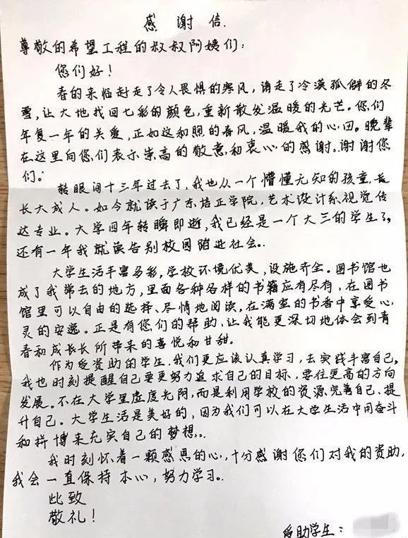 一路资助小李的冯先生多次给她回信,希望她慢慢接受父亲离去的这件事,要记住自己不是无依无靠的孩子,并带着对父亲的思念努力生活、好好学习。