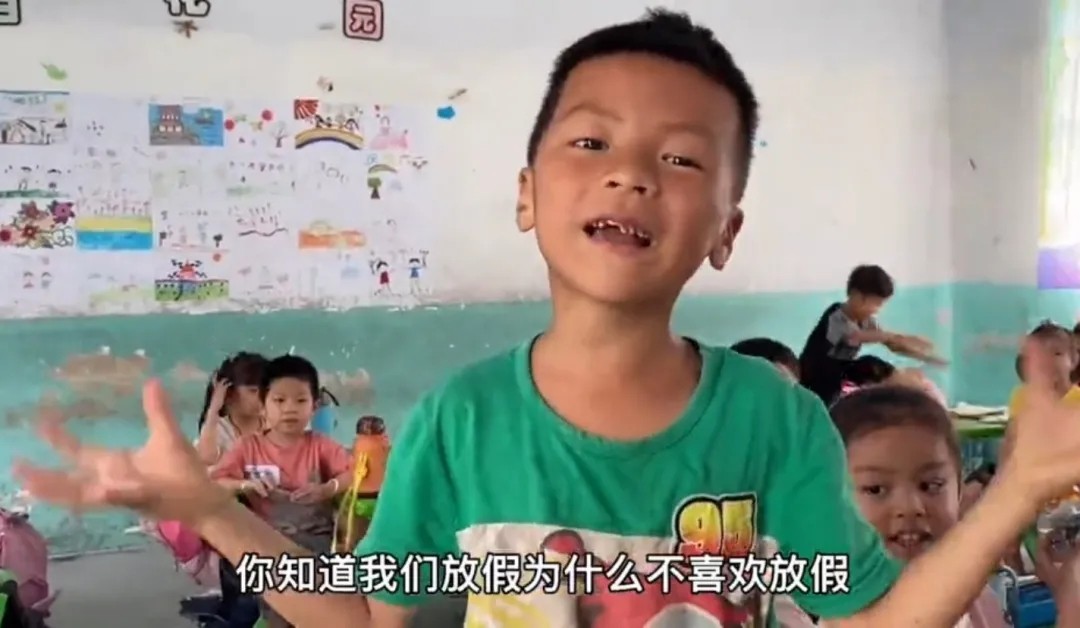 “你知道我们为什么不喜欢放假吗?”照片里的小男孩自问自答,“就是(因为)见到不到老师了”。