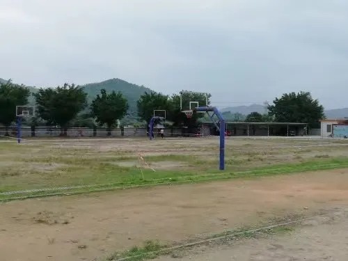 沙土地面篮球场,篮板脱落,是学校唯一的活动场地
