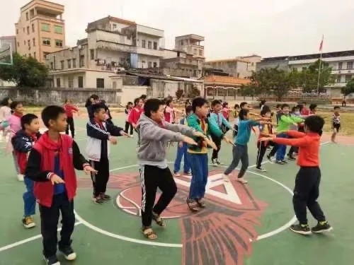 在新篮球场上运动的丰林小学师生