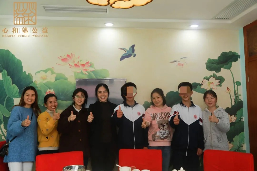 受资助的双胞胎与心和塾公益基金会工作人员合影