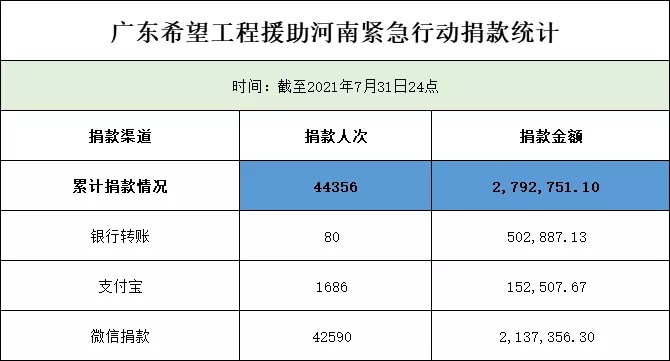 截至7月31日24点,广东希望工程援助河南紧急行动累计筹集2792751.10元。同时向河南省青少年发展基金会拨付200万元,用于河南汛情救援救灾工作的开展。