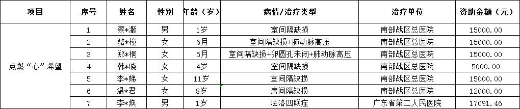 项目共计救助7名困难患儿,资助金额达94091.46元。资助名单详见下表 ↓