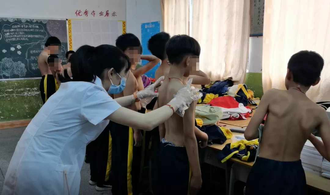 工作人员正在为学生进行健康筛查,并建立脊柱健康档案