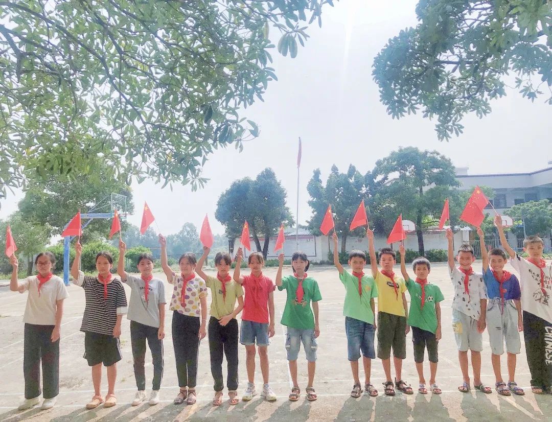 学生们手举五星红旗合影