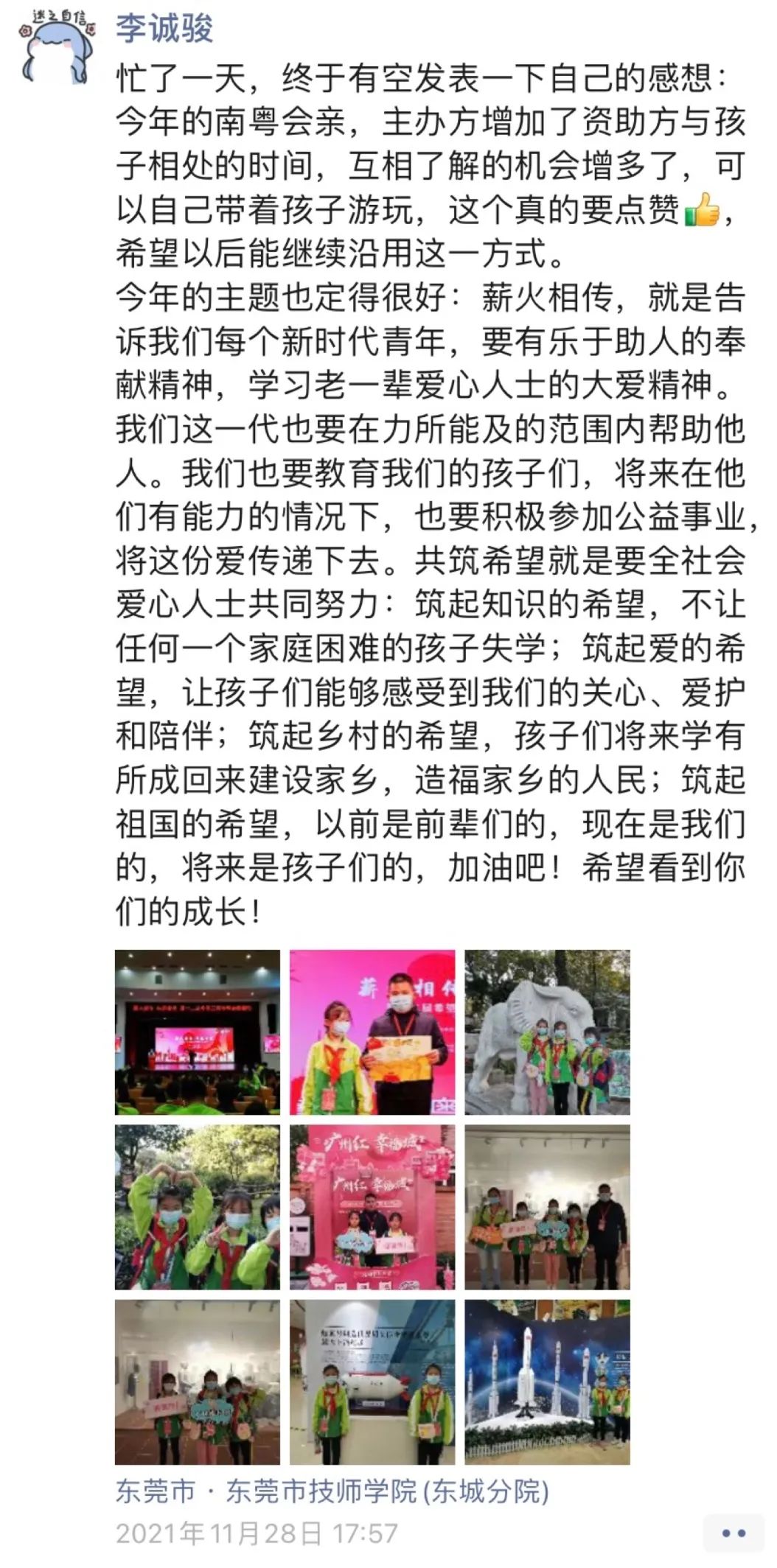 “我希望小朋友们能够将这次来广州会亲的旅程铭记在心中,将资助他们的叔叔阿姨、哥哥姐姐的爱铭记在心中,希望工程是你们坚实的后盾,希望你们在学校勇于钻研、刻苦学习,预祝你们能够取得好成绩!加油,你们是祖国的花朵,是祖国的希望,未来是你们的!”