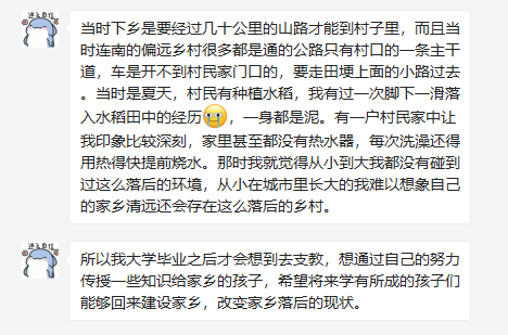 罗仰纯最开始了解到希望乡村教师计划是在大三那年,当时她偶然间看到了乡教计划的推文,被孩子们可爱的笑容感染,忍不住收藏了那篇文章。后来疫情爆发,她在新闻中看到一批批医护人员奔赴一线抗疫,内心深受触动。她想,是不是有一天,自己也能像这些逆行英雄一样,成为带来希望的人。后来在宣讲会上,她看到乡村孩子们那一双双努力写字的小手,突然间觉得这就是等着她去完成的事情,在这种使命感般的召唤下,去年毕业后,她加入了乡教计划。