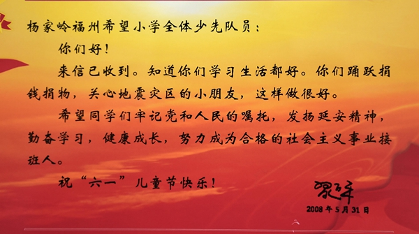 2008年六一前夕,这封信得到了回应!习近平在回信中表扬了孩子们,并祝他们儿童节快乐!2009年和2016年,习近平还两度亲自探访杨家岭福州希望小学,关心孩子们的学习生活情况。