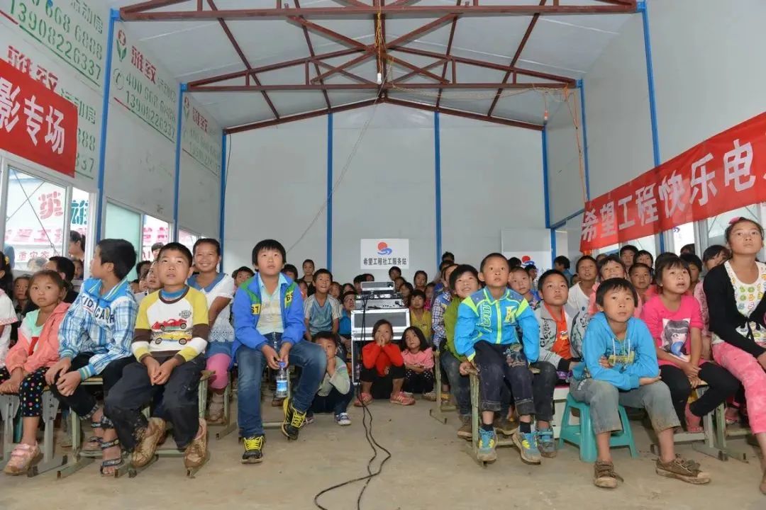云南省鲁甸抗震希望小学(用板房搭建的过渡性校舍)——孩子们在抗震希望小学观看电影
