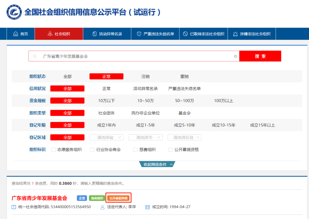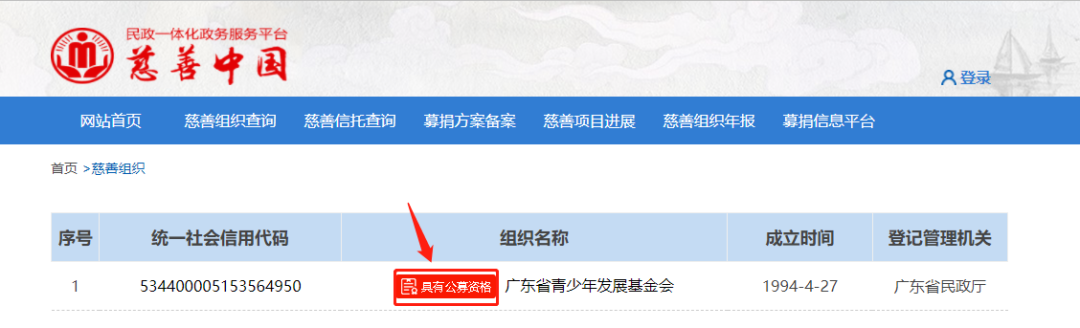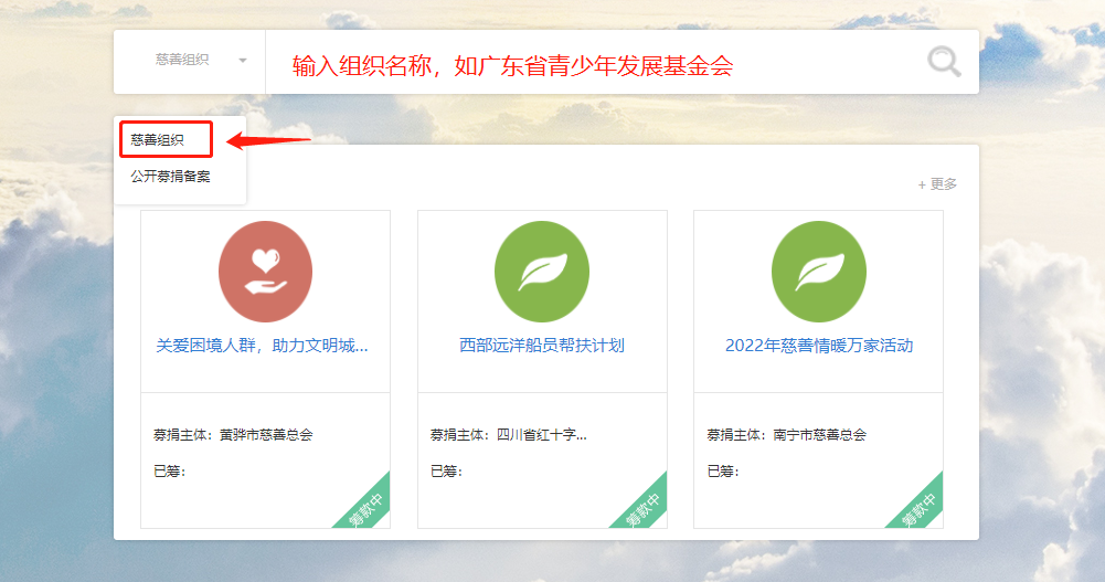 在搜索框左方选择慈善组织,输入组织名称后查询