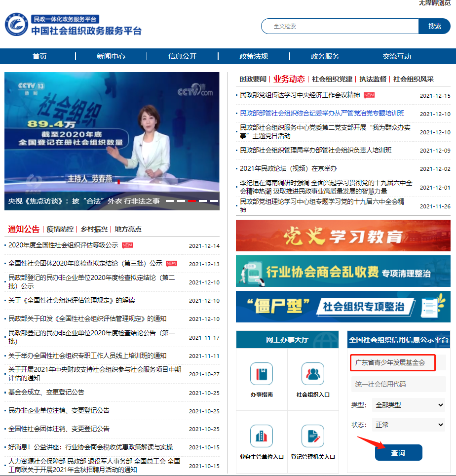进入官网,在全国社会组织信用信息公示平台搜索框中输入组织名称,点击查询