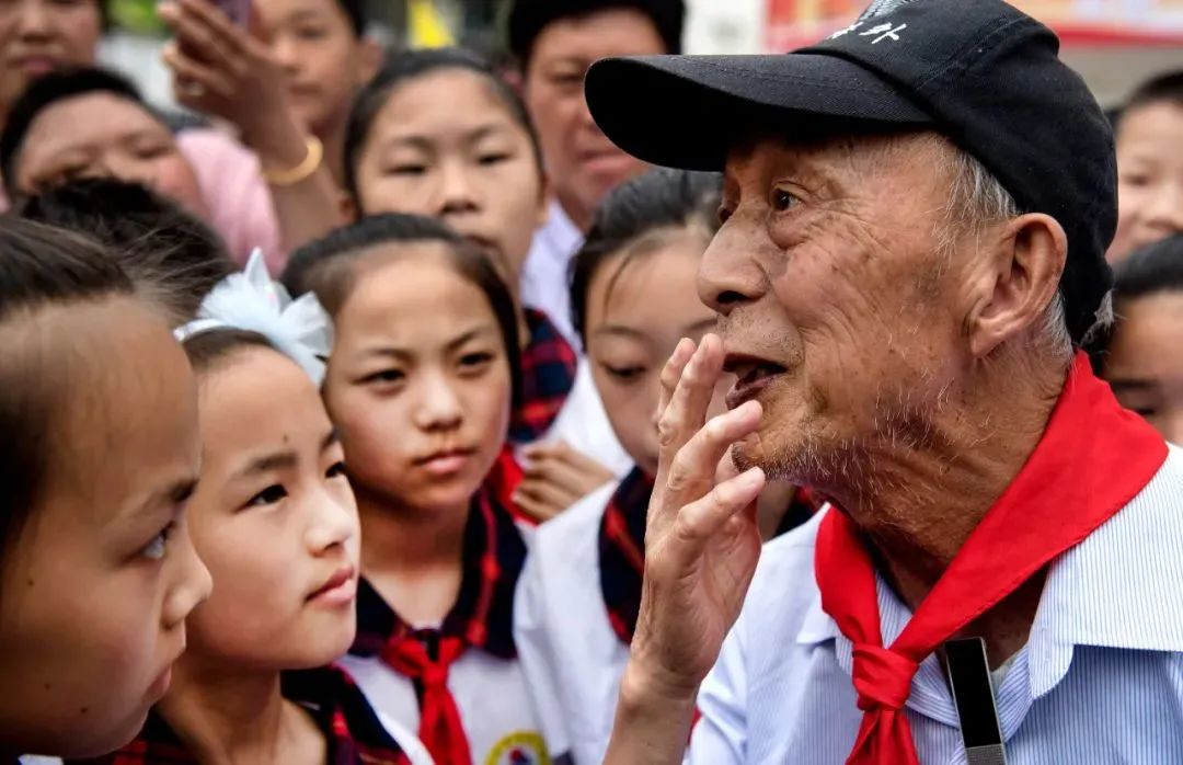 2018年5月19日,周火生老人(前右)与金寨县希望小学的孩子们在一起交谈。