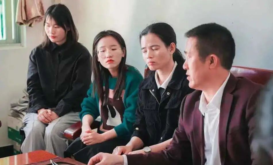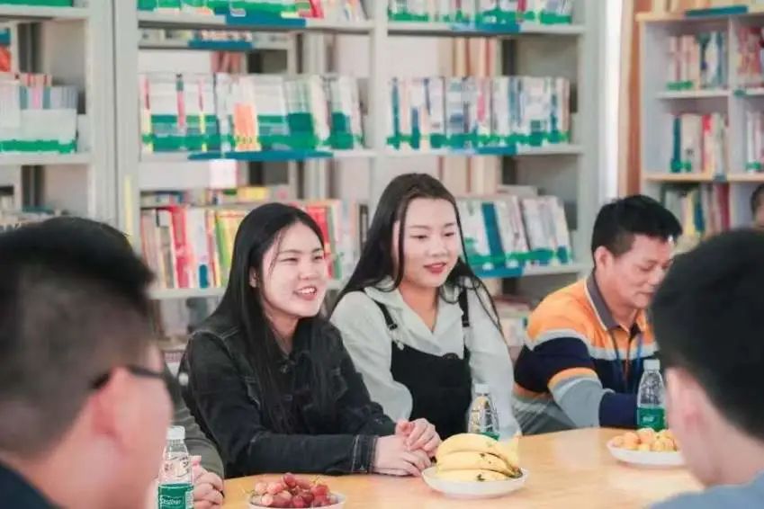 广东青基会访校团队在当地开展志愿者座谈会,了解支教志愿者教学情况,左二为朱曼莉。