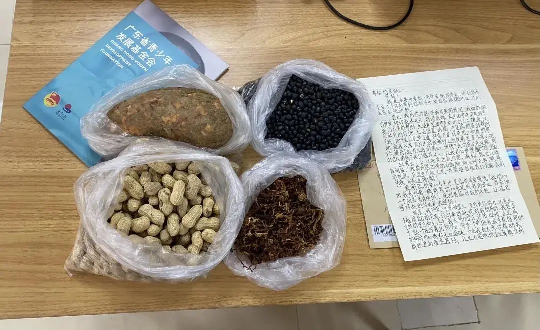 2021年,广东青基会通过各类助学项目共发放助学金853万元,资助困难学子5892人,包含3816名小学生,1419名中学生,657名大学生。为感谢爱心人士的资助,受助学生小林不仅写了一封感谢信,还寄来了自家种的花生、红薯、黑豆和自家晾晒的萝卜干,贴心的小林还在快递中附上纸条,细心地写好做法。