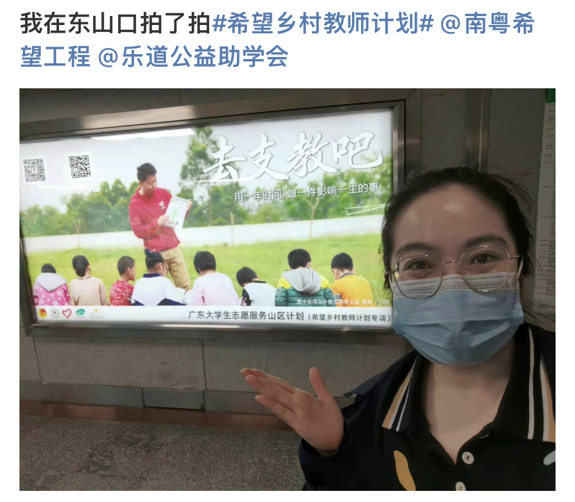 在新浪微博发布:“我在XX(地铁站名)拍了拍#希望乡村教师计划#@南粤希望工程@乐道公益助学会”并附上你拍下的乡教地铁广告照片