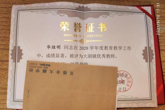 “大洞镇优秀教师”荣誉证书
