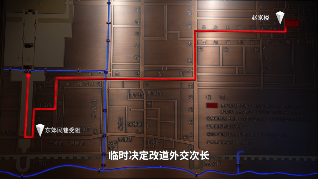 这是当年五四游行的线路图,学生们原本计划集会后沿东交民巷通过使馆区,面晤英,美,法,意公使,面递山东问题建议书,但是在东交民巷西口受阻,临时决定改道外交次长曹汝霖住处赵家楼。