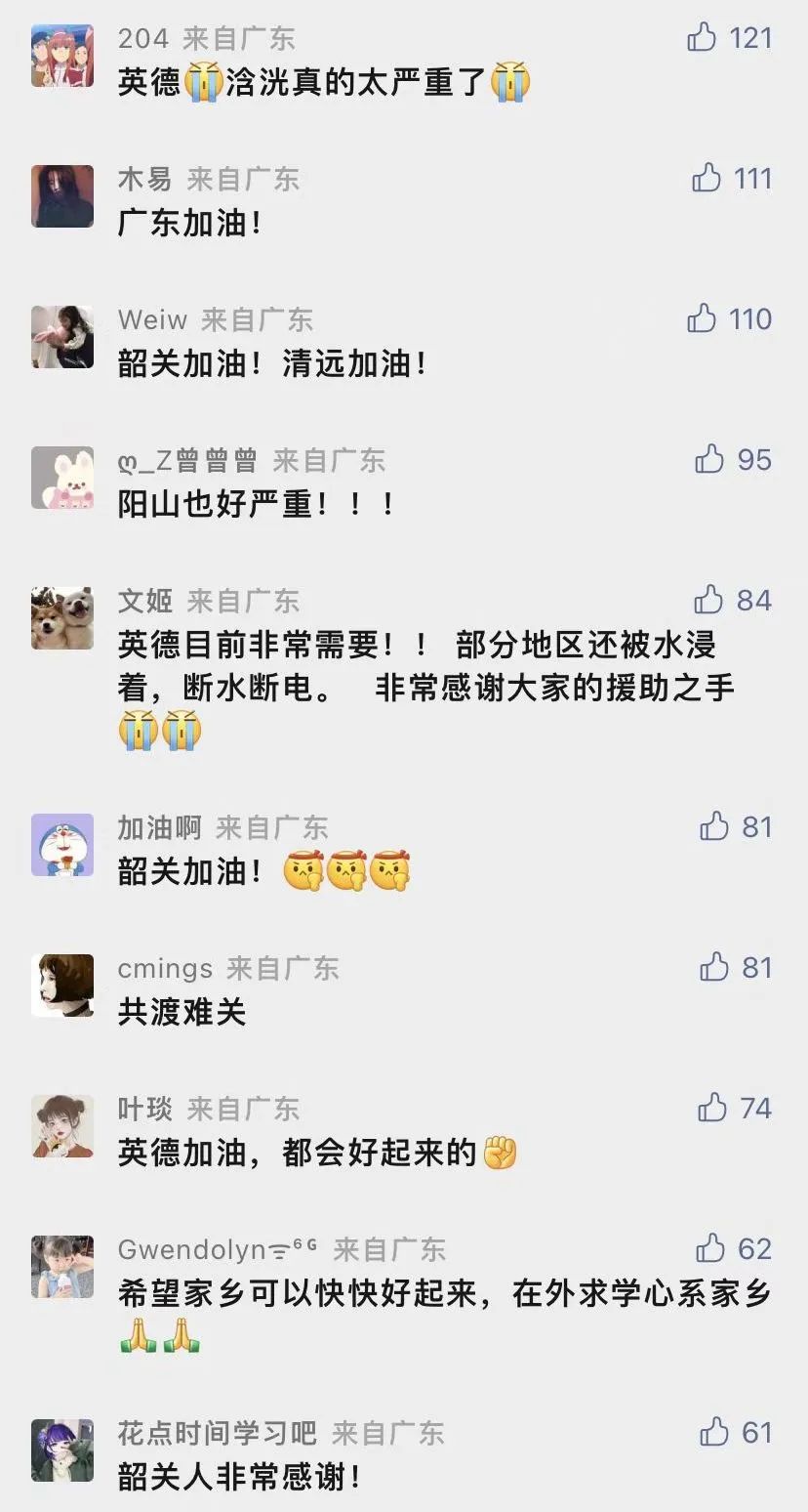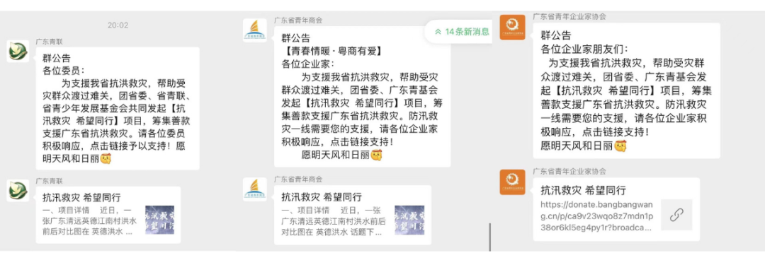 广东青基会将收集到的韶关11个县区、清远阳山、英德24个镇街等受灾地区一线物资需求,通过广东共青团官微“广东共青团”、中国青基会官微“希望工程”、广东青基会官微“南粤希望工程”发布《我们来了!韶关、清远急需物资+捐款渠道,扩!》等8条推文,吸引超46.9万人关注。