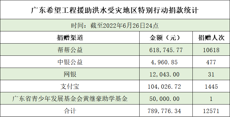 截至6月26日24:00,广东青基会共收到捐款12571笔,合计捐赠金额789,776.34元。