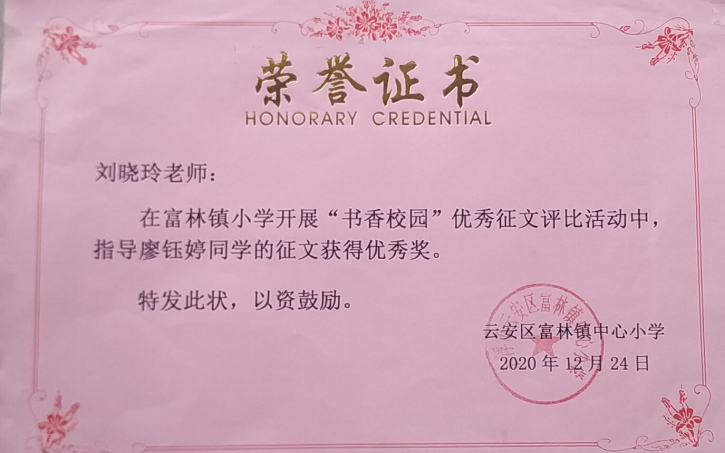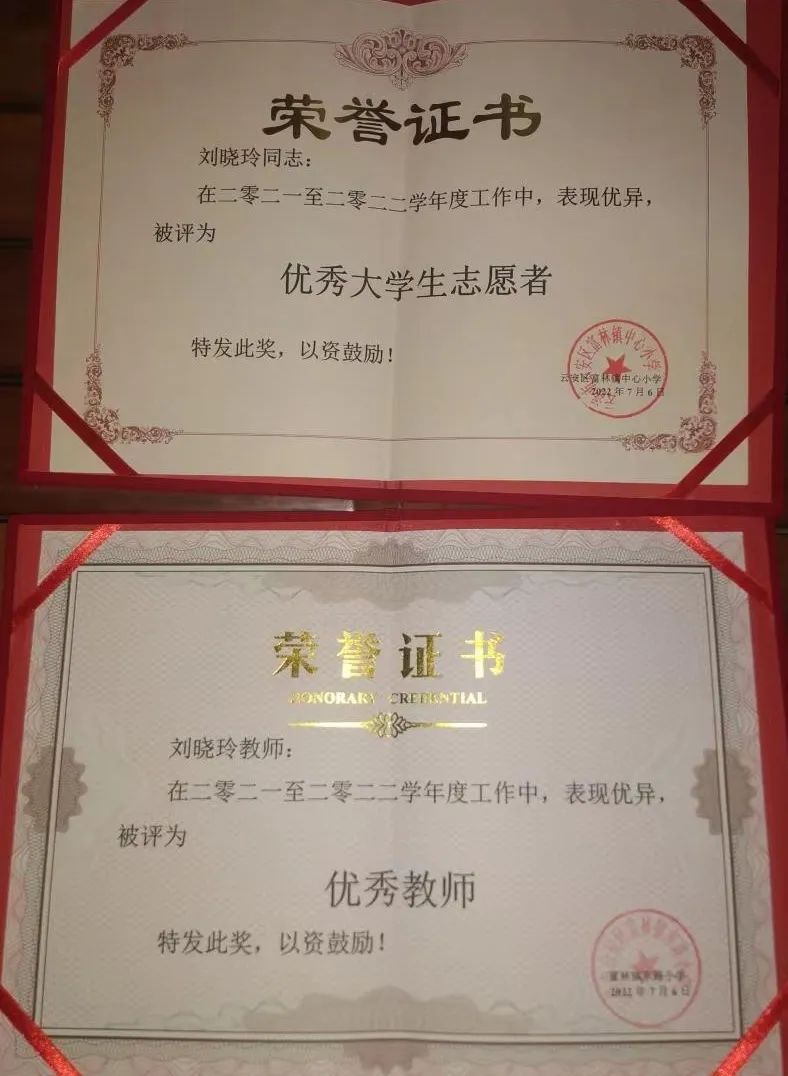 在刘晓玲的不懈努力下,三年的支教生涯也取得了不少成果。不仅指导学生获得了许多区、镇级的写作奖项,孩子们的学习成绩也得到了显著地提高。她的工作也得到了学校方面的肯定,获得了“优秀大学生志愿者”与“优秀教师”的荣誉。