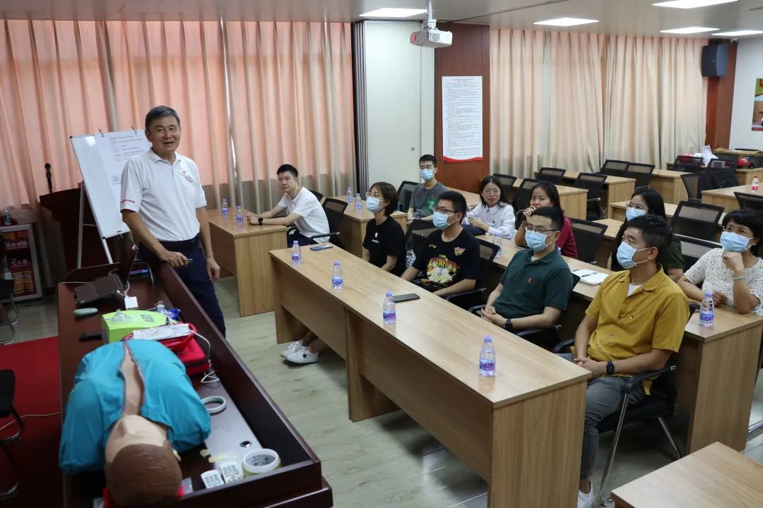 虞敏同志用深入浅出的语言讲解了掌握基本急救技术的重要性和必要性,重点介绍了心肺复苏等急救技能的操作要点和相关知识,讲授了如何帮助被施救者调整体位、打开气道、判断呼吸、进行胸外心脏按压和人工呼吸等知识,进行心肺复苏和AED机的技能实操。