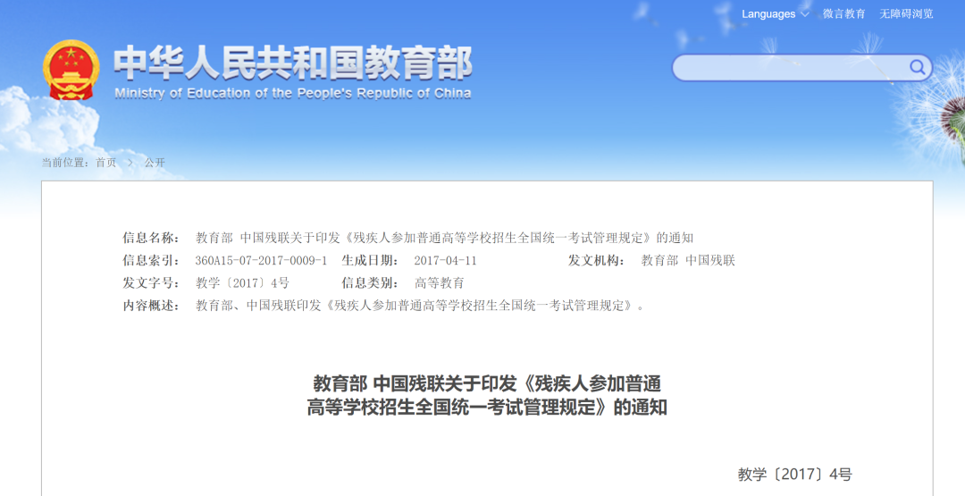 2017年教育部和中国残联联合印发《残疾人参加普通高等学校招生全国统一考试管理规定》,文件中提到: