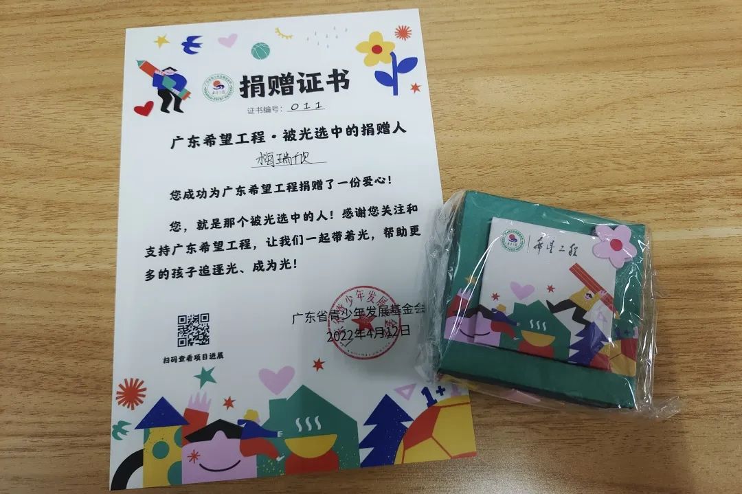 在收到广东青基会邮寄的证书与纪念币后