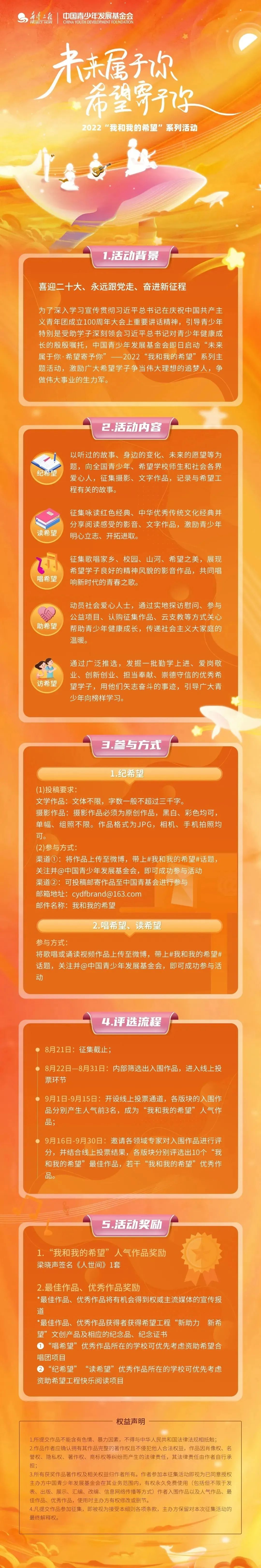 为了深入学习宣传贯彻习近平总书记在庆祝中国共产主义青年团成立100周年大会上重要讲话精神,引导青少年特别是受助学子深刻领会习近平总书记对青少年健康成长的殷殷嘱托,中国青少年发展基金会启动“未来属于你 •希望寄予你”——2022 “我和我的希望” 系列主题活动,激励广大希望学子争当伟大理想的追梦人,争做伟大事业的生力军。