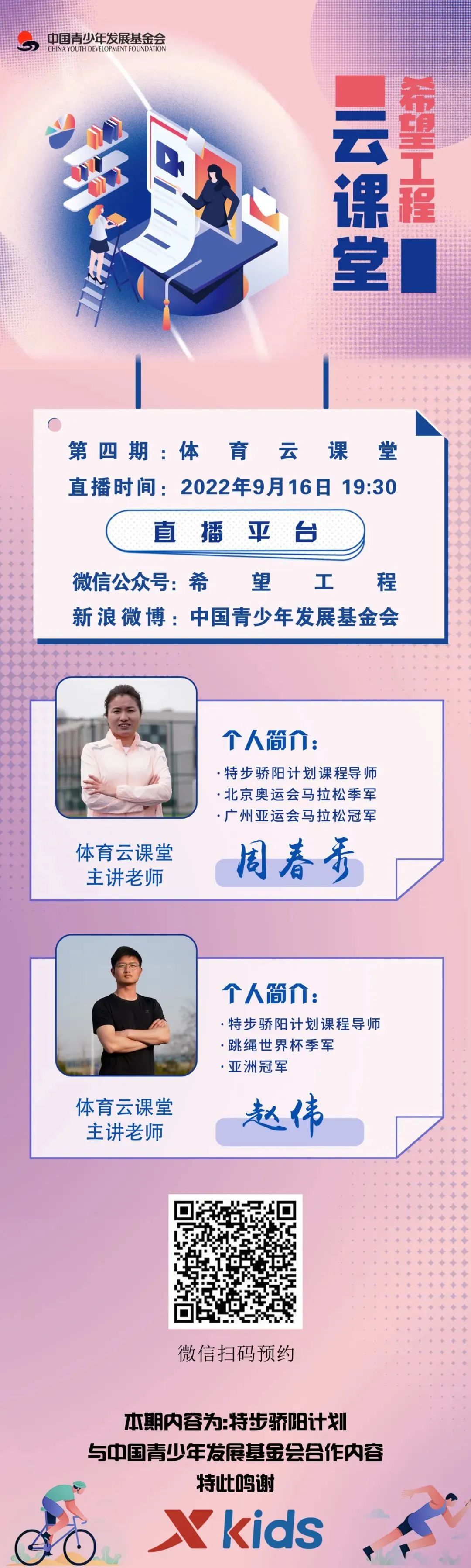 在这期云课堂里我们邀请两位运动冠军来上网课他们分别是曾获得广州亚运会马拉松冠军和北京奥运会马拉松季军的周春秀以及亚洲冠军跳绳世界杯季军赵伟他们也是特步骄阳计划课导师在直播中他们将跟广大青少年朋友们一起分享在跑步和跳绳中用到的小技巧、小方法特别适合热爱体育的你一起来学习、了解吧!