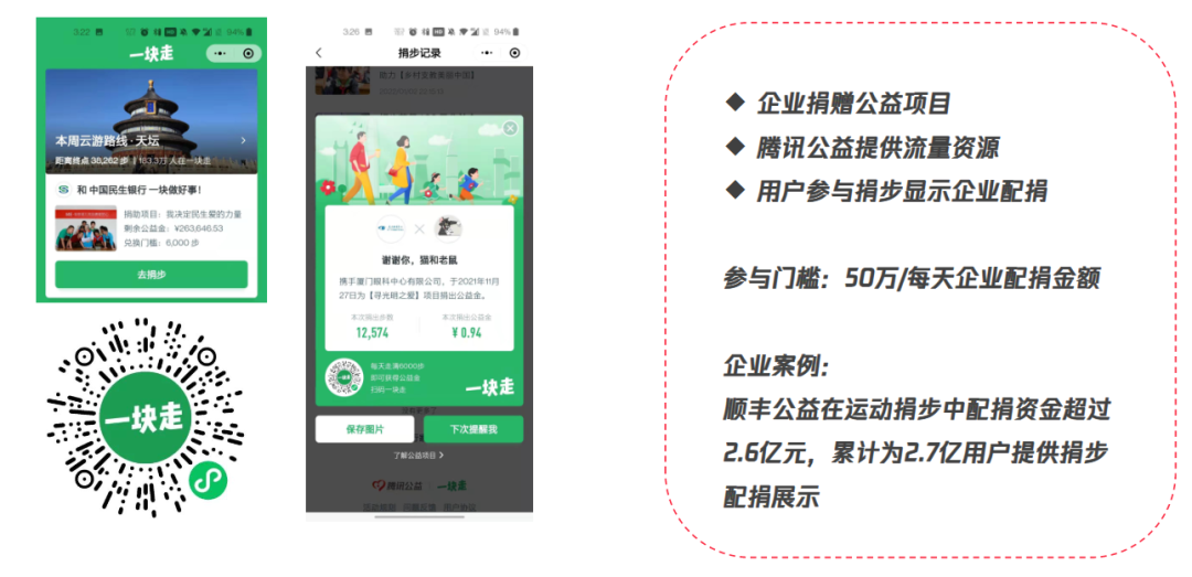 捐赠50万元及以上的企业,可参与“平台一块走”。用户通过“一块走”小程序捐步一次,即可显示企业配捐一次。