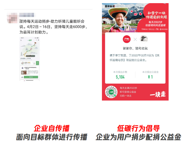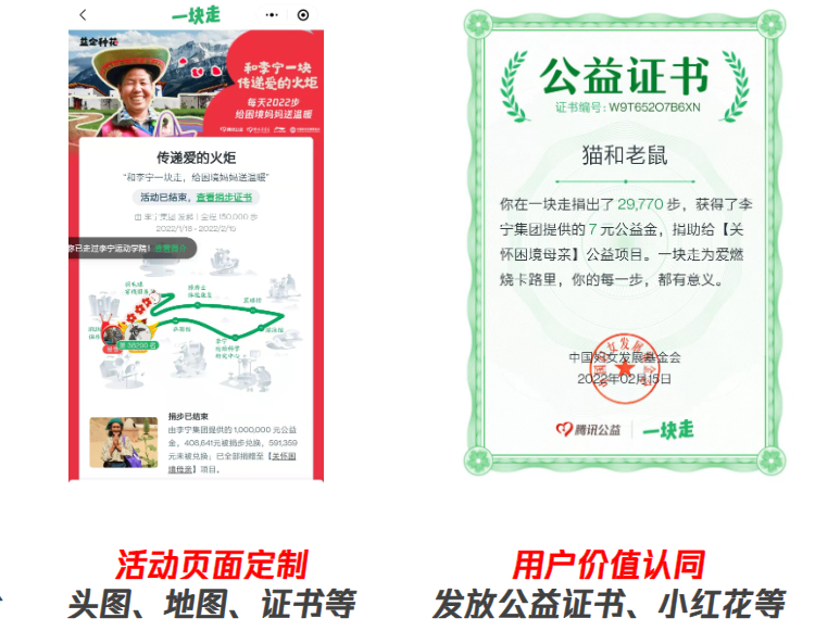 个人或以企业名义捐赠50元以上,可参与“定制一块走”,联动企业员工与用户,轻量参与公益。