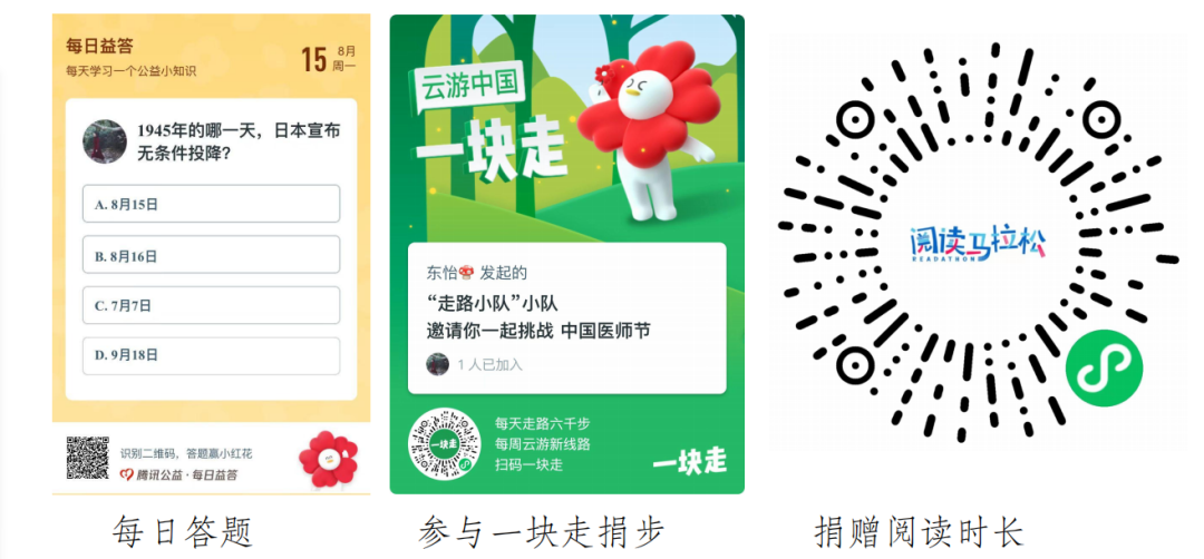 动员企业员工、用户、消费者参与小红花活动,通过每日答题、捐步6000步、阅读马拉松打卡等方式获得小红花,在99公益日期间捐出小红花,可以获得腾讯更多配捐金额。