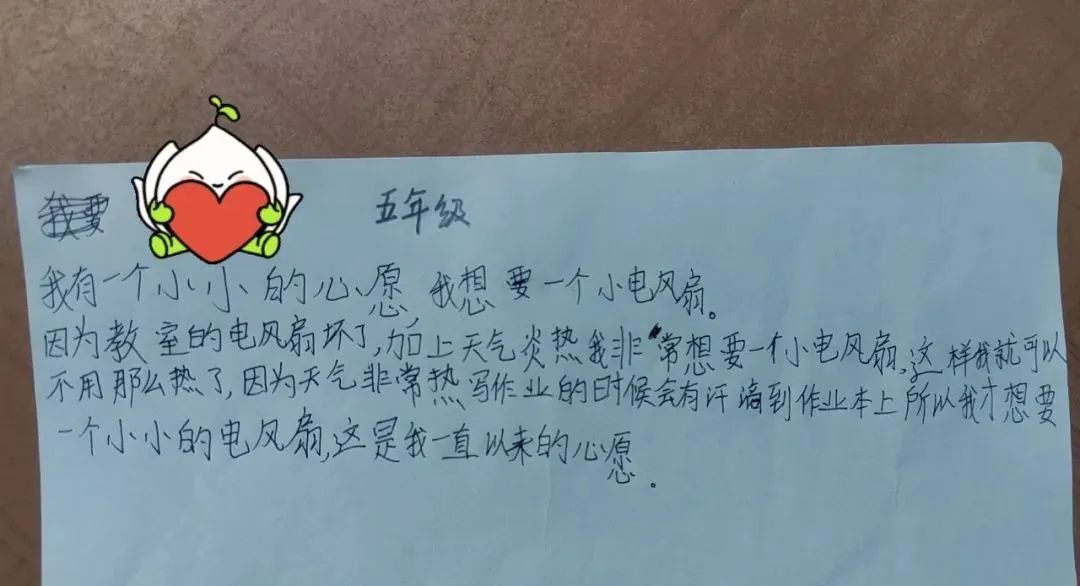 因为天气非常热,写作业的时候会有汗滴到作业本上,所以我才想要一个小小的电风扇,这是我一直以来的心愿。