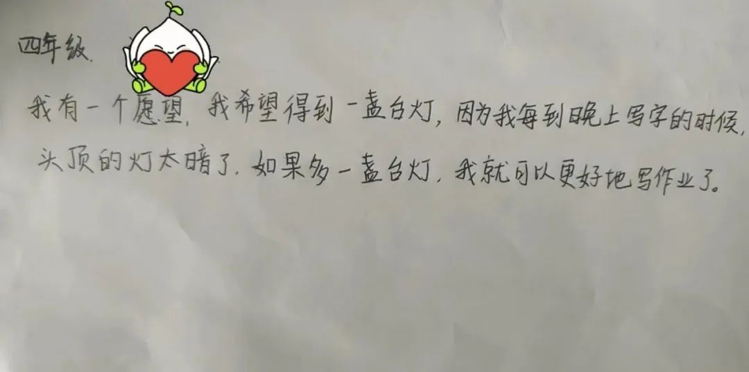 我有一个愿望,我希望得到一盏台灯,因为我每到晚上写字的时候,头顶的灯太暗了,如果多一盏台灯,我就可以更好地写作业了。