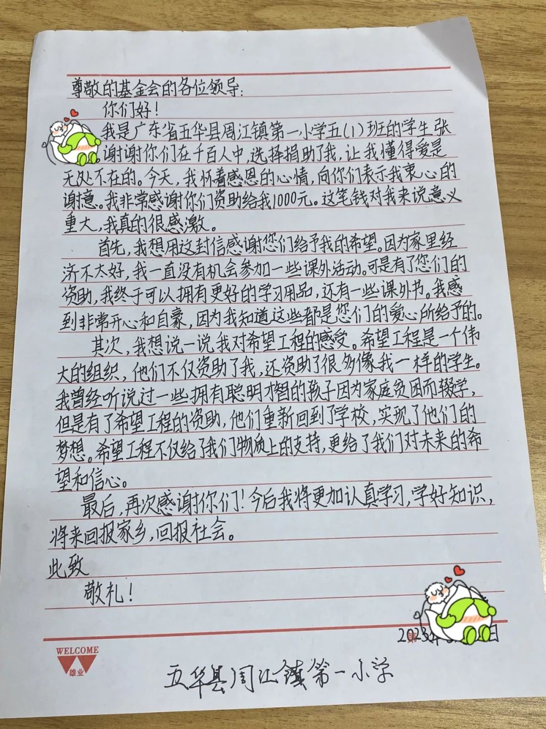 首先,我想用这封信感谢您们给予我的希望。因为家里经济不太好,我一直没有机会参加一些课外活动,可是有了您们的资助,我终于可以拥有更好的学习用品,还有一些课外书。我感到非常开心和自豪,因为我知道这些都是您们的爱心所给予的。