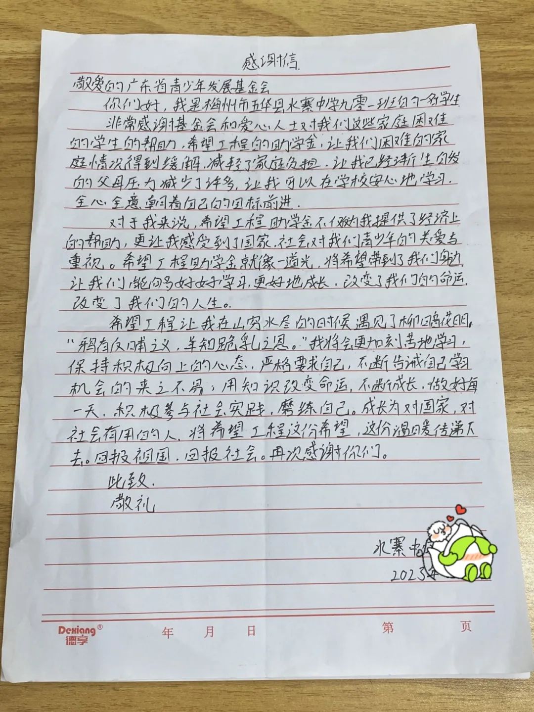 基金会的叔叔阿姨,你们好!很高兴能以书信的方式向你们表达感激。我来自农村,受助前每逢开学季,家长就需要为学费而苦恼,这对我的学习生活也造成了困扰,幸运的是,这种困扰并没有持续很久,希望工程给我们带来了希望,你们的帮助,给我们的家庭减轻了很大的负担,让我接受平等的教育,让我真切地感受到社会的关爱。