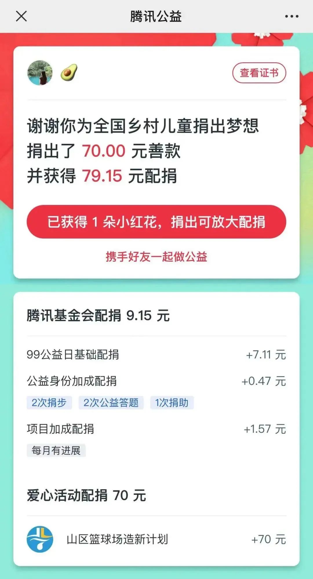 【山区篮球场造新计划】收到的每笔不低于1元的用户捐赠,均有机会获得腾讯基金会提供的随机金额配捐;