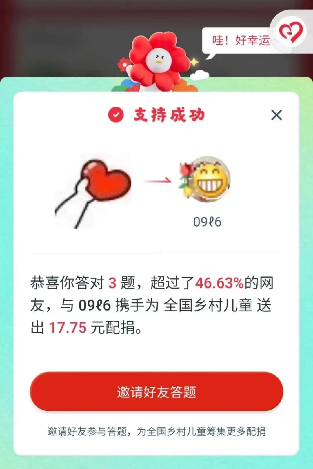 【山区篮球场造新计划】每位用户捐赠不低于1元善款后,均可邀请好友助力,通过“答题得配捐”的形式,将每一笔爱心捐款扩散
