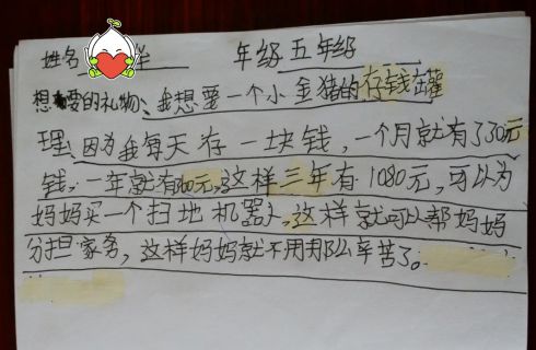 浏览量:3287 2022-06-02 15:29:42今天是六一儿童节 在这个有爱的日子 你是否回忆起难忘的童年回忆 那些曾在儿童节达成的心愿 如果童年的你 有一个实现愿望的机会 你会许下什么愿望呢? 今天,我们想和大家分享 来自孩子们的一些小小心愿 这些简单又朴实的愿望 藏着广东乡村的孩子们 对美好生活的期待和向往 一起看看↓↓↓ 我想要一个小金猪存钱罐 “我每天存一块钱,一个月就有30元钱,一年就有360元,这样三年有1080元,可以为妈妈买一个扫地机器人,就可以为妈妈分担家务,这样妈妈就不用那么辛苦了!” 一盒固体的水粉颜料 “我喜欢在家里画画,我想用这盒固体颜料画出我心里想的一切美好事物。” 一顶可以遮阳的帽子 “我爸爸是一名工人,整天都顶着太阳工作,他的脸都晒红了。” 存钱密码箱 “我的零花钱一直都无家可归。” 《鲁迅全集》 “我想要《鲁迅全集》,因为平时无聊时可以看看,看书能让我学习知识,认识新字。” 一个地球仪 “说到礼物啊!我最想要的是一个地球仪,因为我的妹妹和弟弟很想去旅行,但因为爸爸妈妈在广州打工很辛苦,赚的也不是很多,我和弟弟妹妹是爷爷奶奶带。 有一次,妹妹哭了,她说要去故宫。但妈妈说‘不行,爸爸妈妈工作很忙’,妹妹生日时,爸爸说给她买地球仪,但他却忘了,所以我想要一个地球仪送给妹妹。” 一个暖手袋 “我家隔壁有一个老爷爷,有八十多高龄了。他孤苦伶仃,无依无靠,只有一只猫和他相依为命。爸爸妈妈经常买菜送去给他,还有村里也有好多热心人给他送吃的。 我也想帮助他,所以我的愿望是能得到一个暖手袋,希望在寒冷的冬天里能给他温暖。” 我想要给妈妈一双毛毛鞋 “因为她在大冬天还穿着那双拖鞋,给我们买鞋却自己舍不得用一分钱。每次我帮她揉脚的时候,她的脚都是冷冰冰。所以我想给她一双毛毛鞋。” 希望工程·微心愿 许下心愿的孩子们来自湛江吴川市塘缀镇大洋明珠花园小学,他们用稚嫩的笔触,一笔一划认真写下一个个微小的愿望。广东省青少年发展基金会通过“希望工程·微心愿”活动,为孩子们实现了这些童真可爱的心愿。 在收集孩子们的心愿时,有一些孩子的愿望朴实得让人心疼: 二年级的小煜希望拥有一套全新的文具,因为他的文具都坏了,“这样写作业的时候就可以不用再找同学借笔了”。 三年级的小雨最想要的是一只玩偶公仔,想念在远方工作的爸爸妈妈的时候,一个人在家里感到孤单的时候,至少还可以有小熊陪着他。 五年级的小慧一直渴望着一套属于自己的课外读物,她在心愿纸条上写下:“家里没有钱给我买闲书,我把希望都寄托在这次的活动,拜托了!” 有的孩子则希望把这个来之不易的机会,让给家里年幼的弟弟妹妹,年迈的爷爷奶奶,辛苦工作的爸爸妈妈,甚至是孤苦无依的邻居爷爷。 他们的心愿看起来那么微不足道,但却让人动容。透过这些微小的心愿,我们得以窥见乡村困境家庭儿童和留守儿童的现状,还有孩子们灿若星辰的心灵。 活动后,孩子们用上了崭新的文具。 也许一次小心愿的实现并不能带来持续或巨大的改变,但我们希望通过这样的微心愿活动,为孩子们增添一份快乐的童年回忆,让孩子们知道,还有很多“大朋友”都在关心着他们,守护着他们,希望他们能快乐成长。 如果您愿意帮助更多乡村儿童实现微心愿,可以加入我们的月捐计划,送出一份心意,一起点亮乡村儿童的心愿池。 扫码加入 希望工程·微心愿